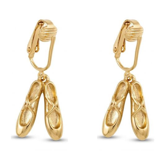 Gold Ballet Slippers Clip On Dangling Earrings