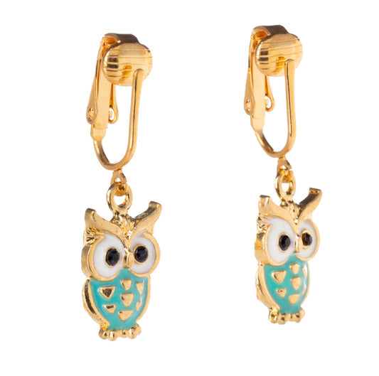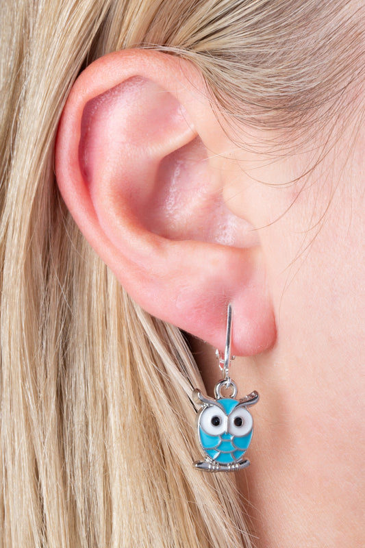 Silver Pink and Blue Owl Clip On Dangling Earrings