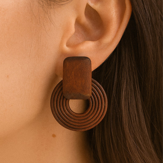 Silver Wooden Circle Cutouts Clip On Dangling Earrings