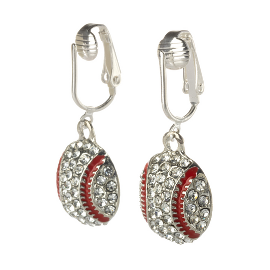 Silver Crystal Baseball Ball Clip On Dangling Earrings