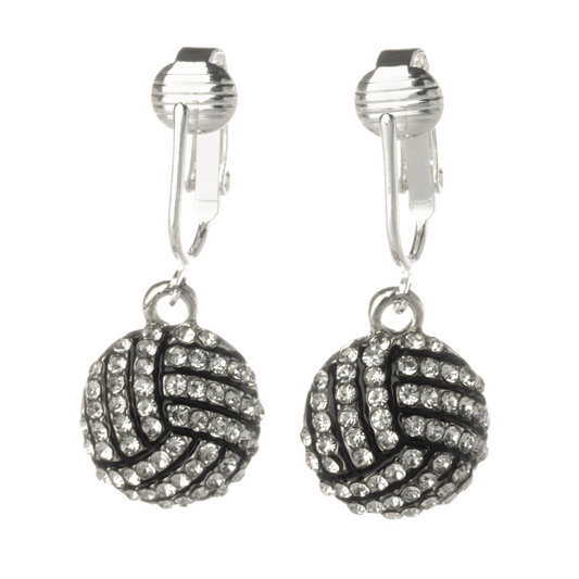 Silver Crystal Volleyball Ball Clip On Dangling Earrings