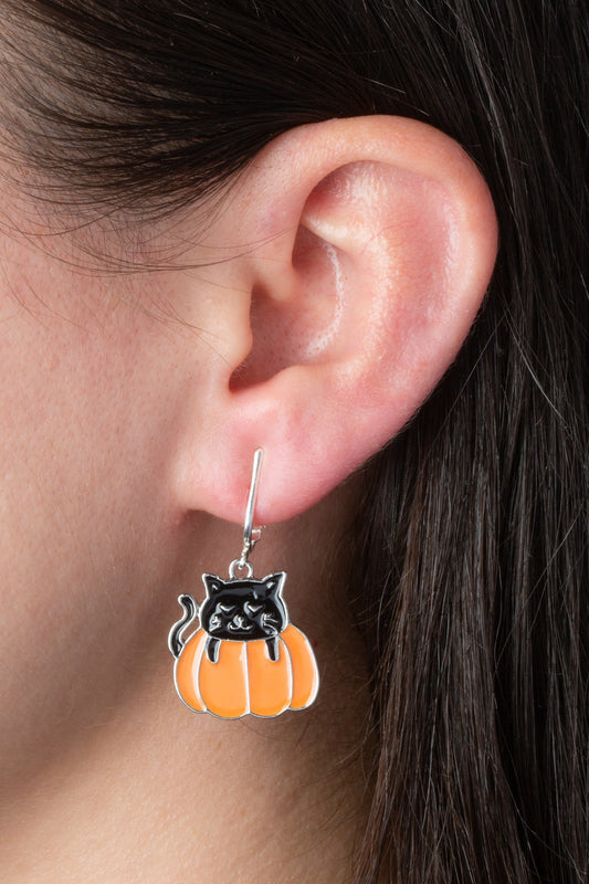 Black Cat in Pumpkin Silver Clip On Dangling Earrings