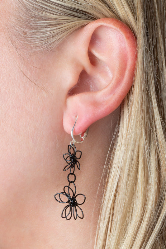 Black Wire Double Flower Silver Clip On Dangling Earrings