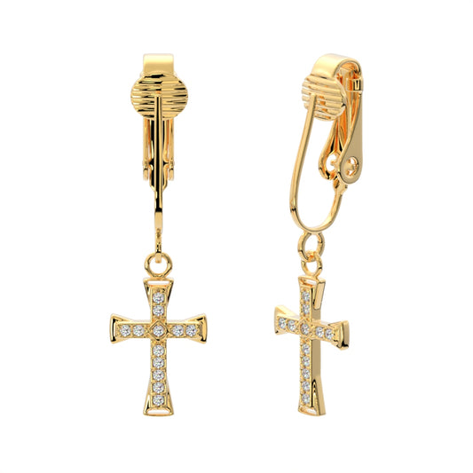 Gold Crystal Paved Cross Clip On Dangling Earrings