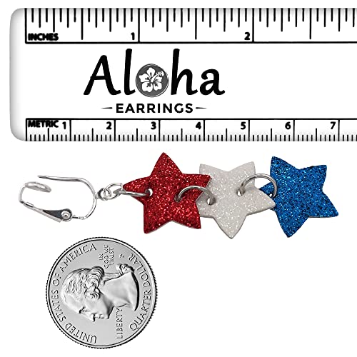 Sparkling Red White and Blue Stars Clip On Dangling Earrings