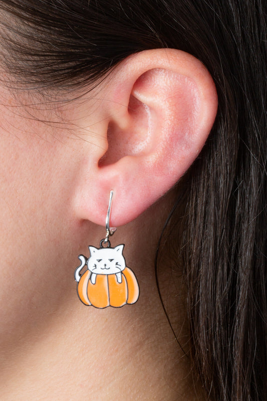 White Cat in Pumpkin Silver Clip On Dangling Earrings