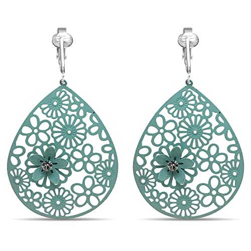 Rhinestone Flower Teardrops Clip On Dangling Earrings