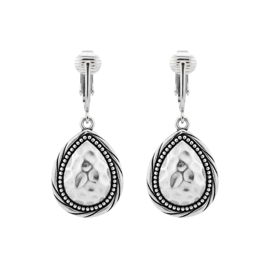 Silver Hammered Dotted Teardrop Clip On Dangling Earrings