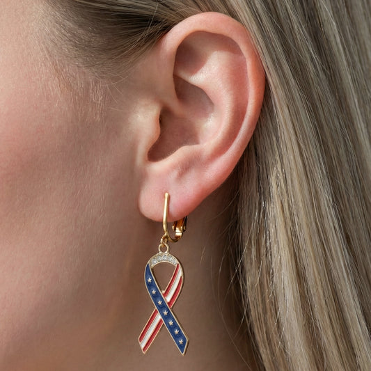 Gold American Flag Ribbons Clip On Dangling Earrings