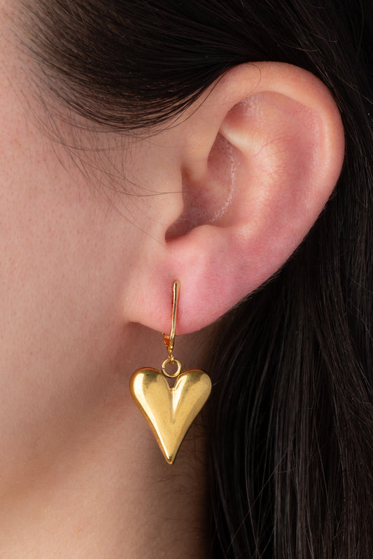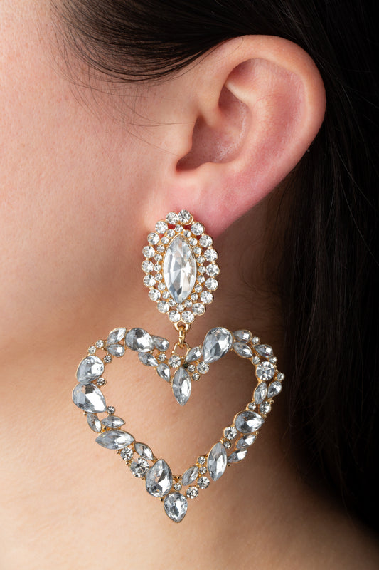 Gold Sparkling Crystal Heart Shaped Statement Clip On Dangling Earrings