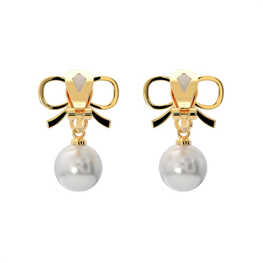 Gold Bow with Dangling Simulated Pearls Clip On Stud Earrings