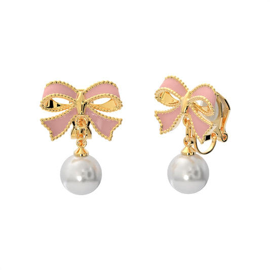 Pink Bow with Dangling Simulated Pearls Clip On Stud Earrings