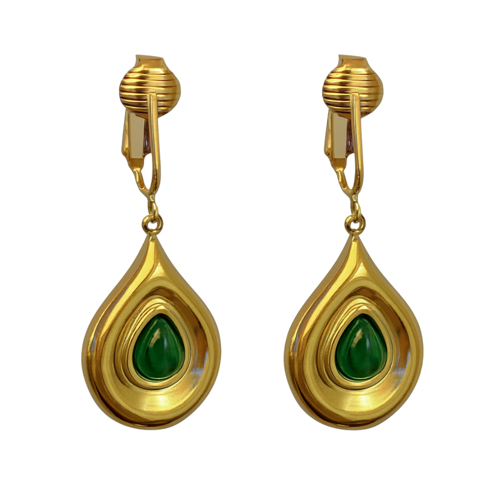 Gold Green Stone Teardrops Clip On Dangling Earrings