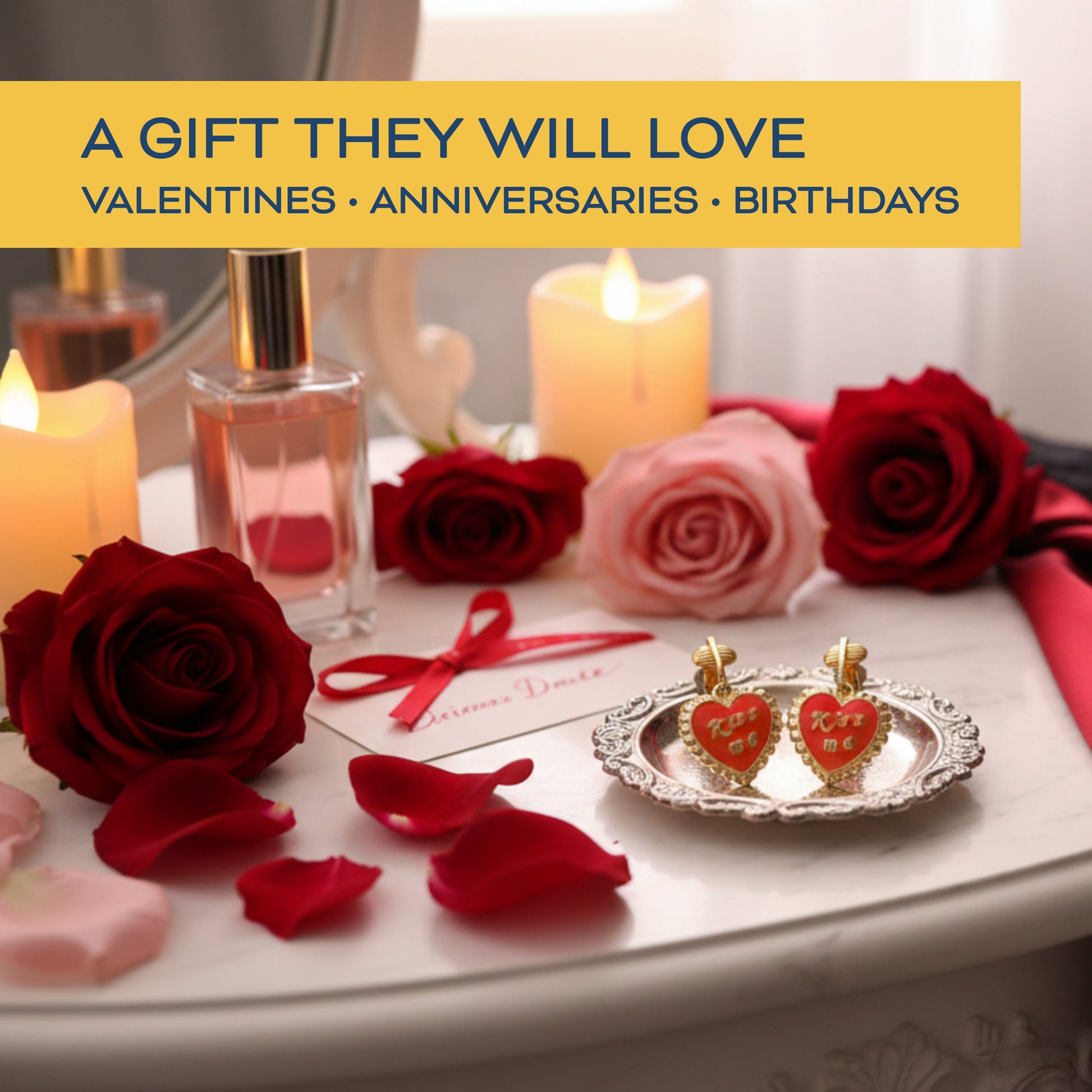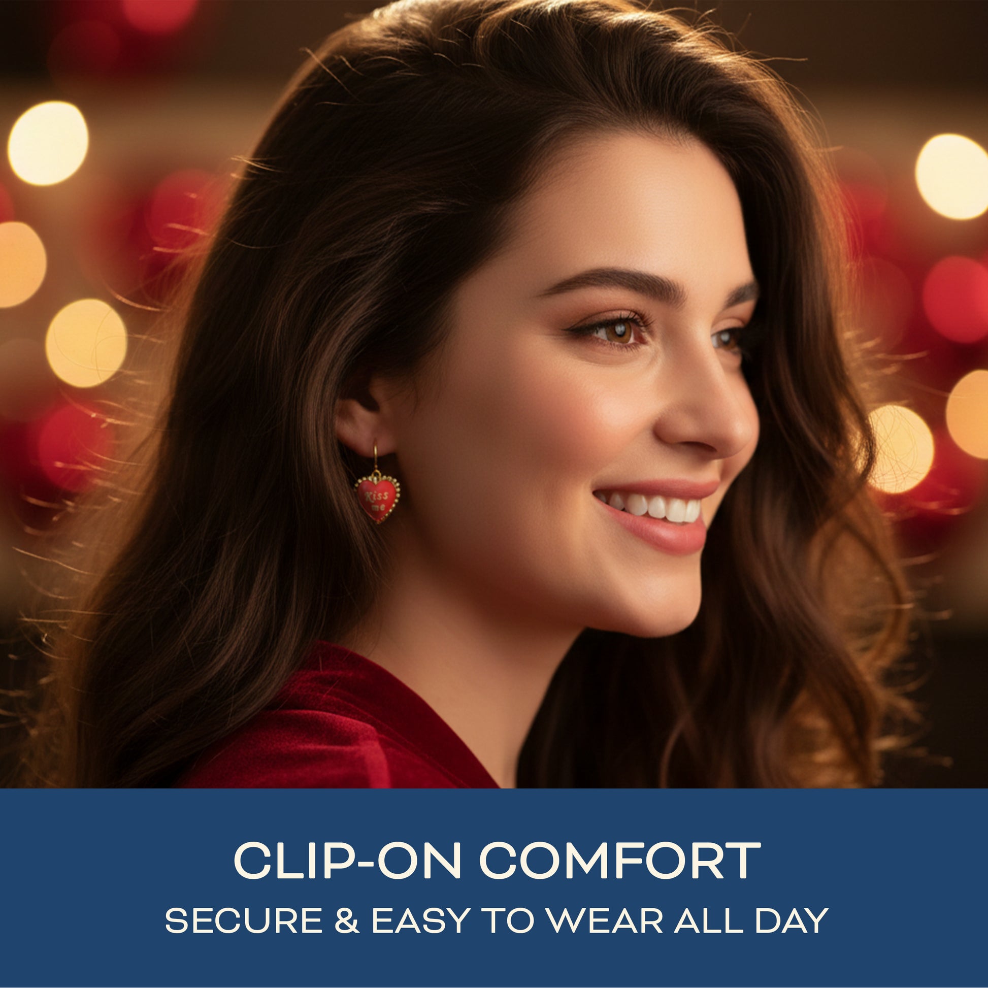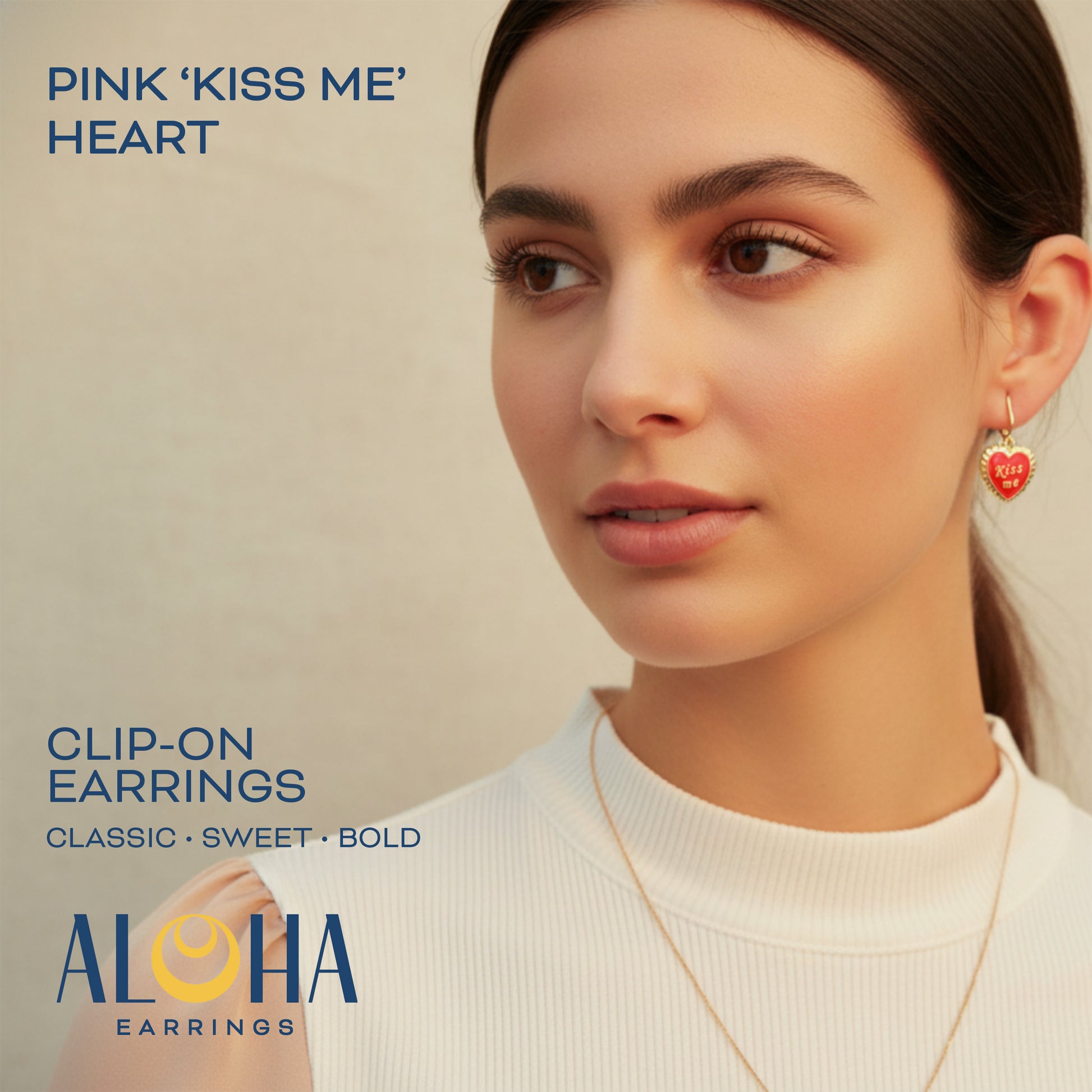 Red Kiss Me Heart Gold Clip On Dangling Earrings
