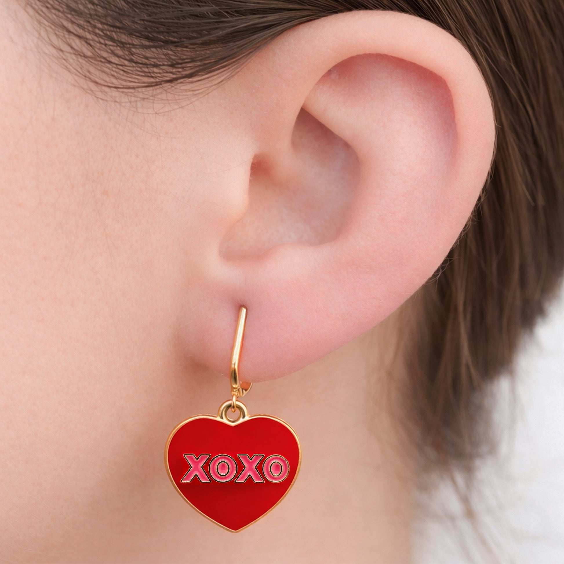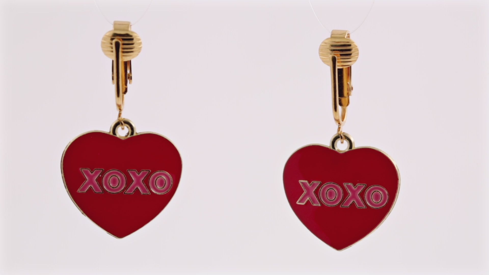 Red XOXO Heart Gold Clip On Dangling Earrings